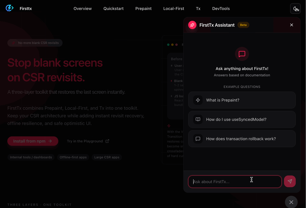 Firsttx는 Prepaint, Local-First, Tx 세개의 레이어로 구성된 오픈소스입니다.
